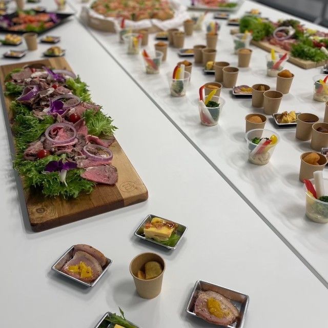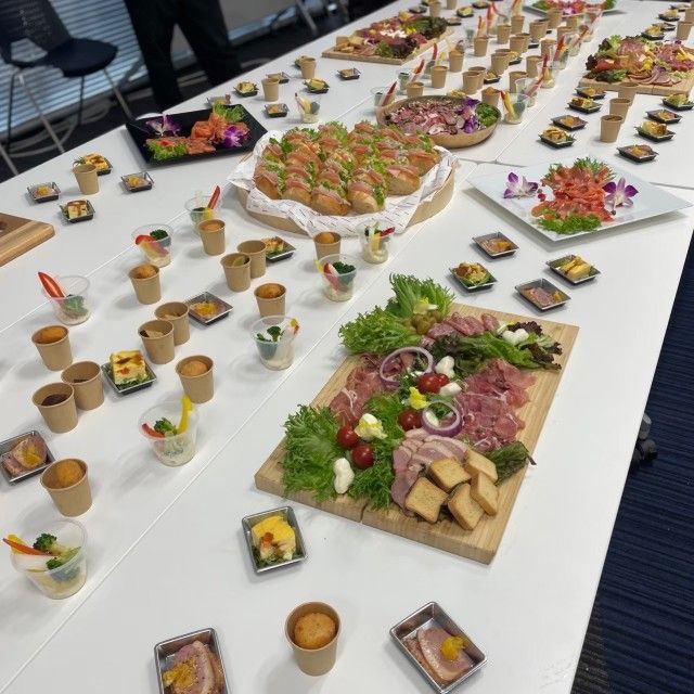 立食形式の交流をスムーズにしながら、見た目の華やかさと食べやすさを両立したスタイルでご好評いただきました。